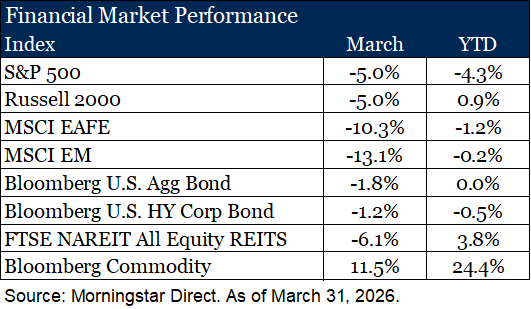 In March Markets gave up much of the gains they had generated for the quarter as the Iranian conflict persisted. Stocks sold off on sentiment and rates rose based on inflation concerns.