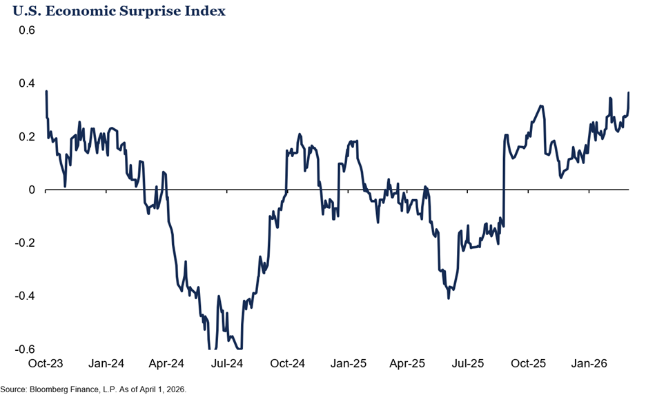 On balance, we see genuine reasons for measured optimism. Earnings growth is broadening, powered by AI and defense spending. The Bloomberg Economic Surprise Index sits near its highest level since 2023, and shelter costs, a stubborn driver of core inflation, continue to moderate. Critically, a soft labor market reduces pressure on the Fed to respond high inflation driven by energy prices. Collectively, these conditions buy time for a diplomatic resolution and create the backdrop under which one can succeed.