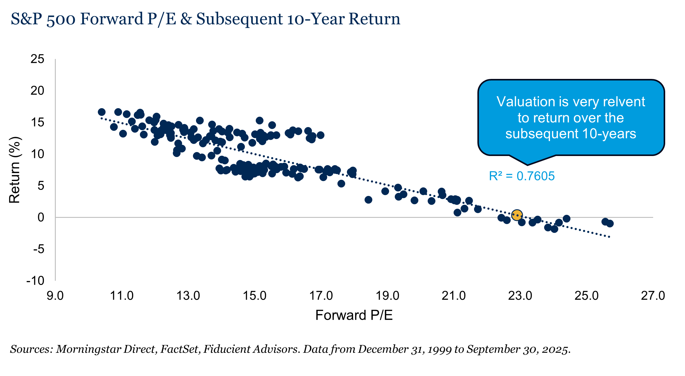Today, markets are expensive by nearly every measure. What does that mean for 2026? As evidenced above, not much. But for long-term investors, it matters a great deal. High valuations call for deliberate risk management, thoughtful diversification, and a clear plan for what to do if prices fall.